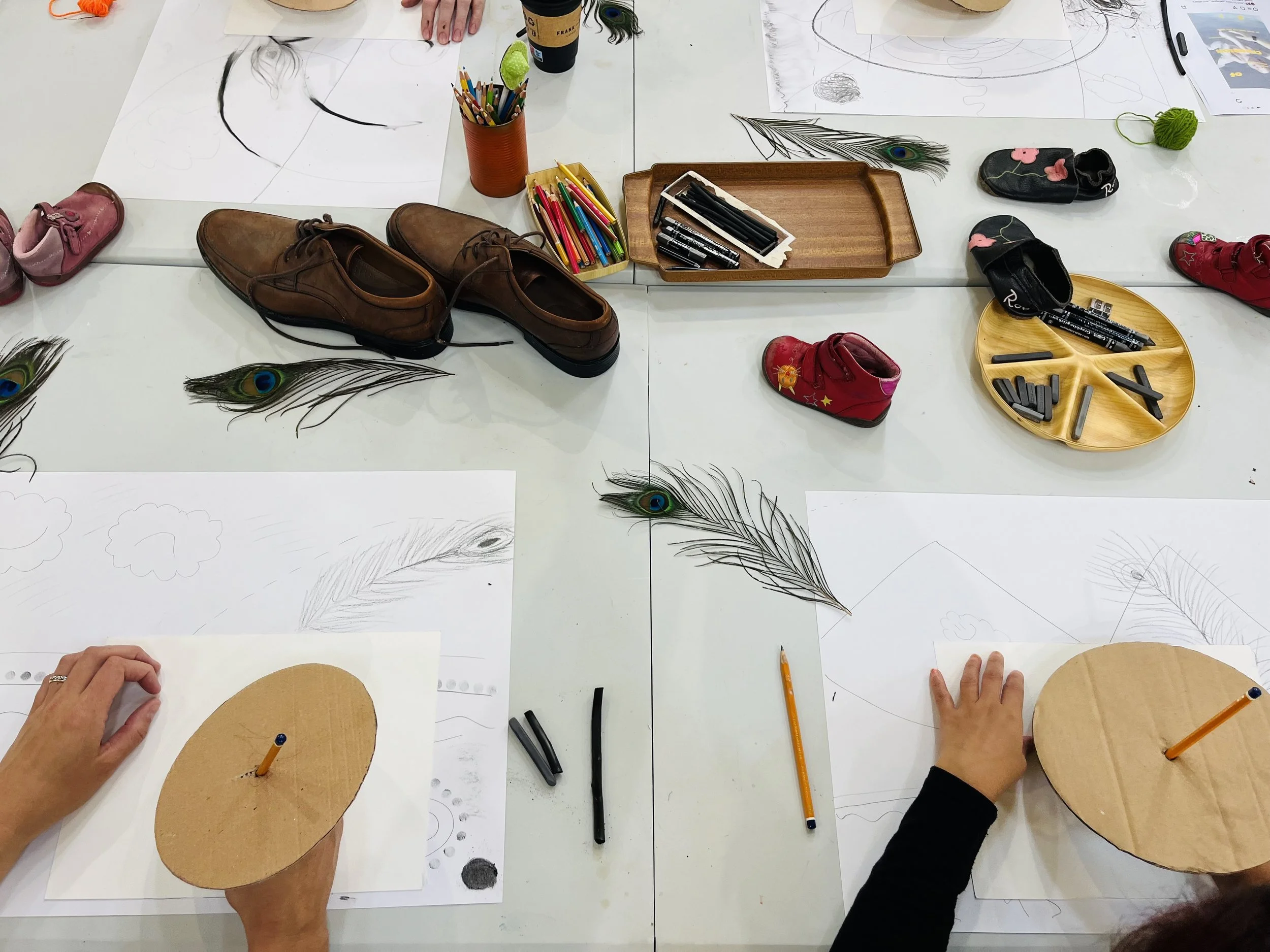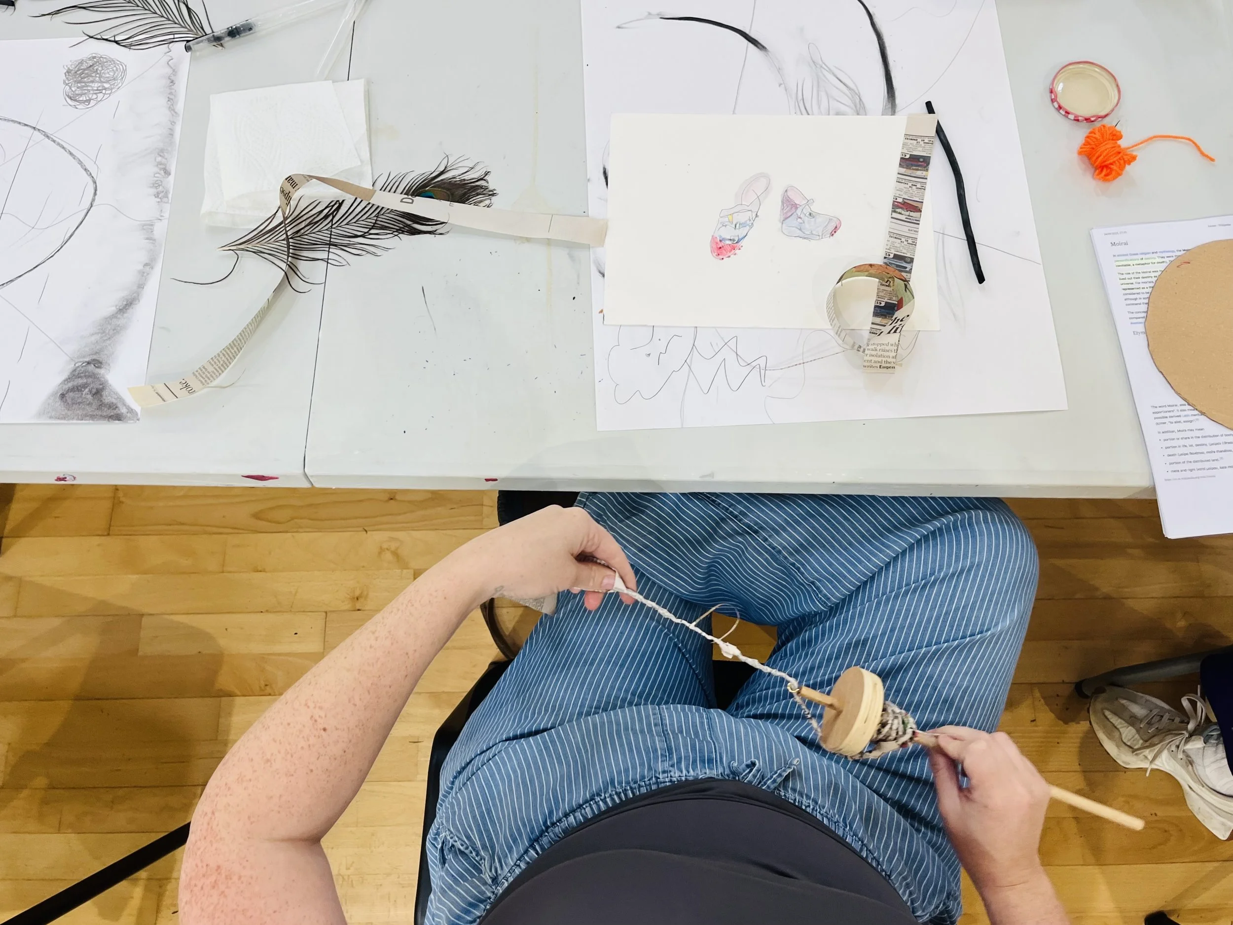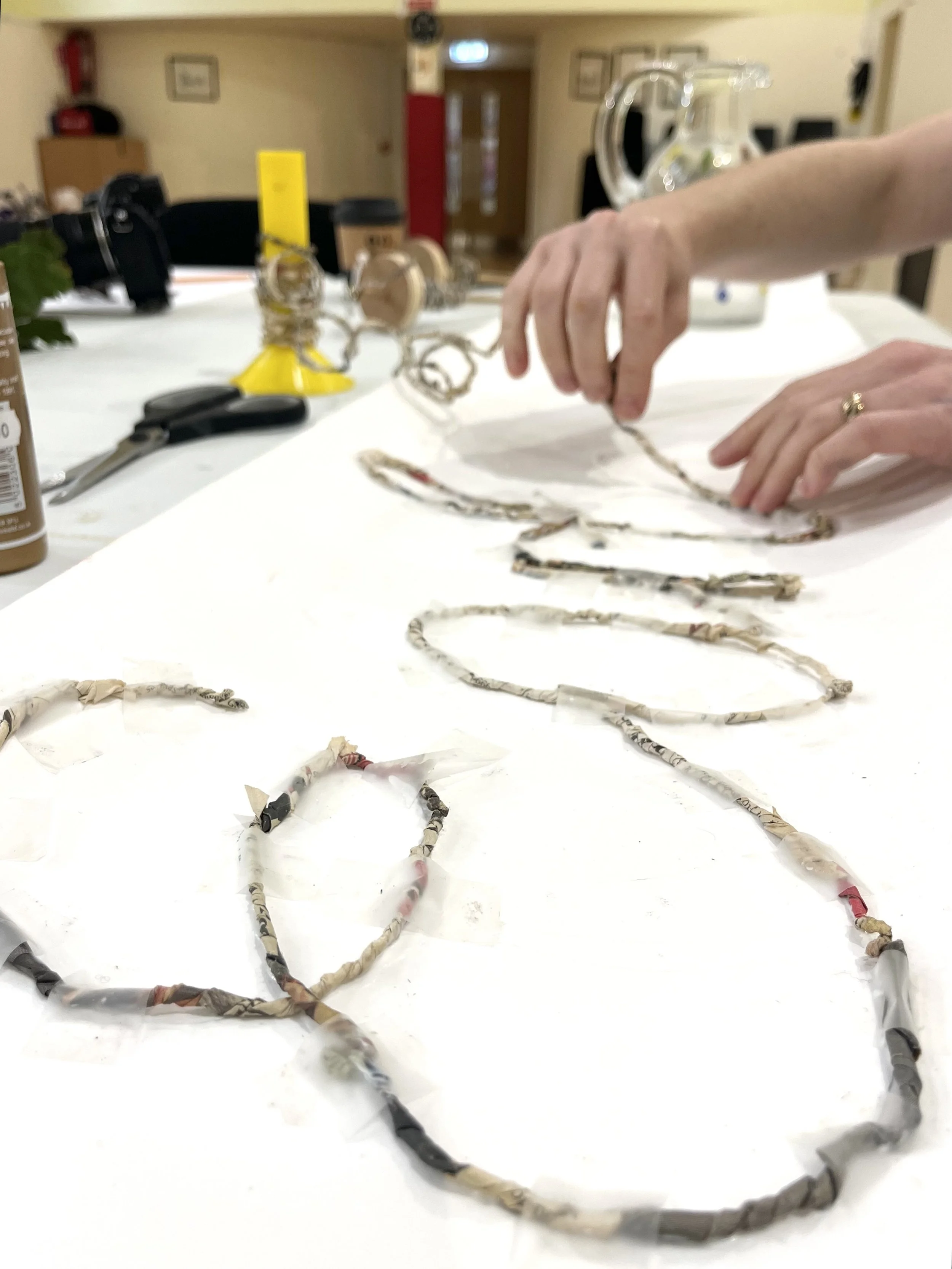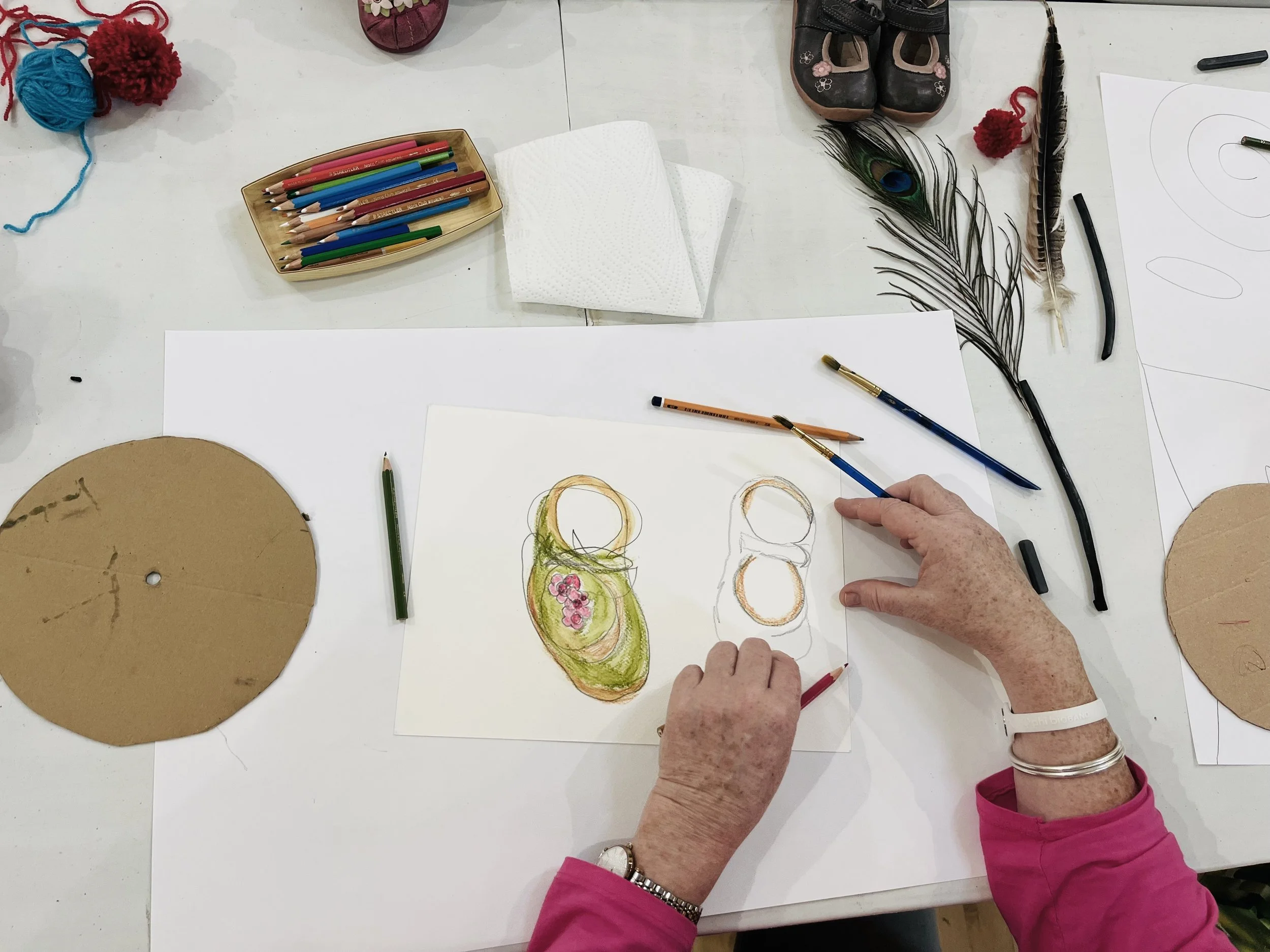 Workshop 1: we explored mark making using pencils, charcoal, graphite sticks and watercolour pencils. Blind drawing helped break the ice for all, as they observed & drew some children’s first shoes. Watercolour pencils added a gentle wash to the drawings. A simple spindle, to twirl strips of paper, allowed up make paper string.