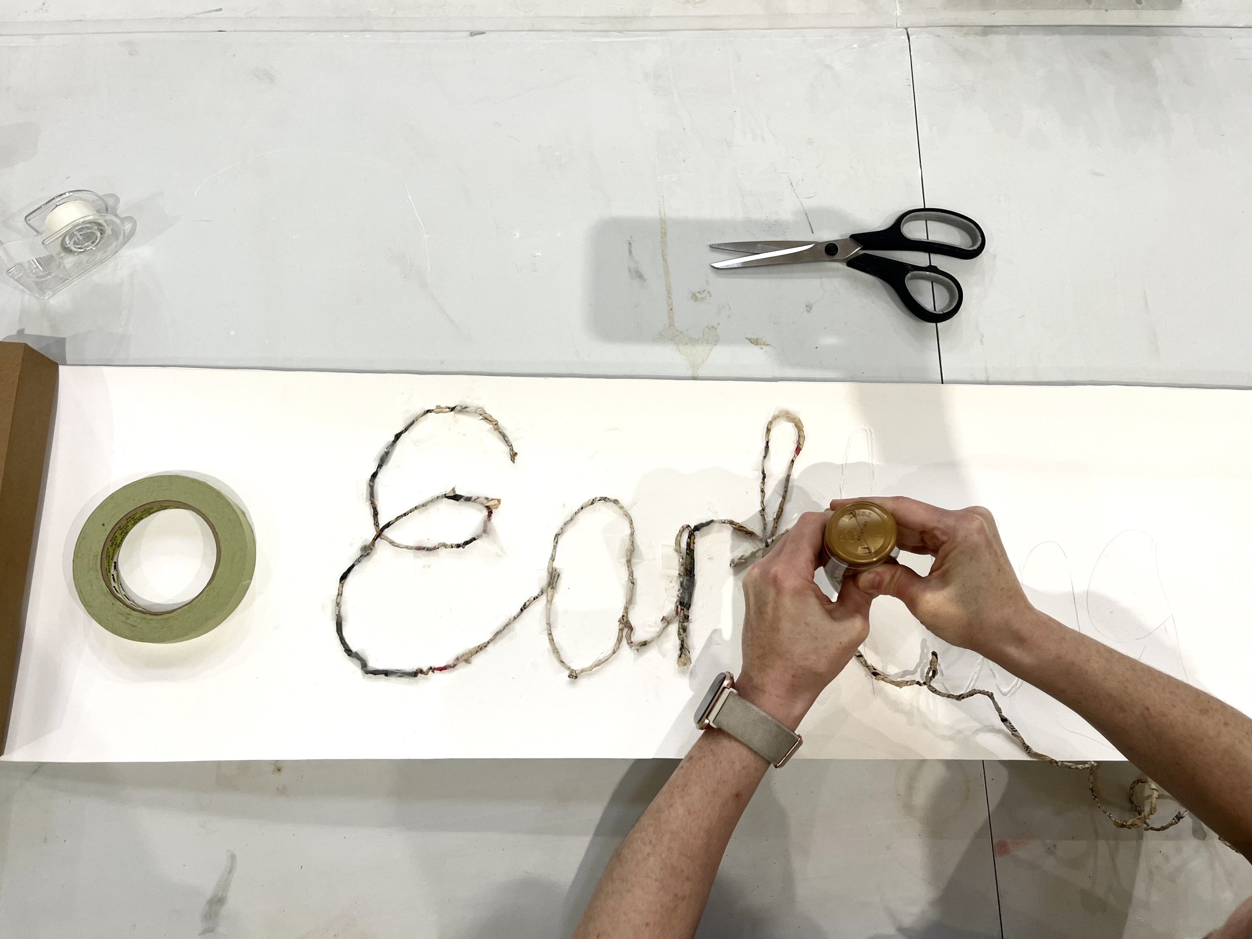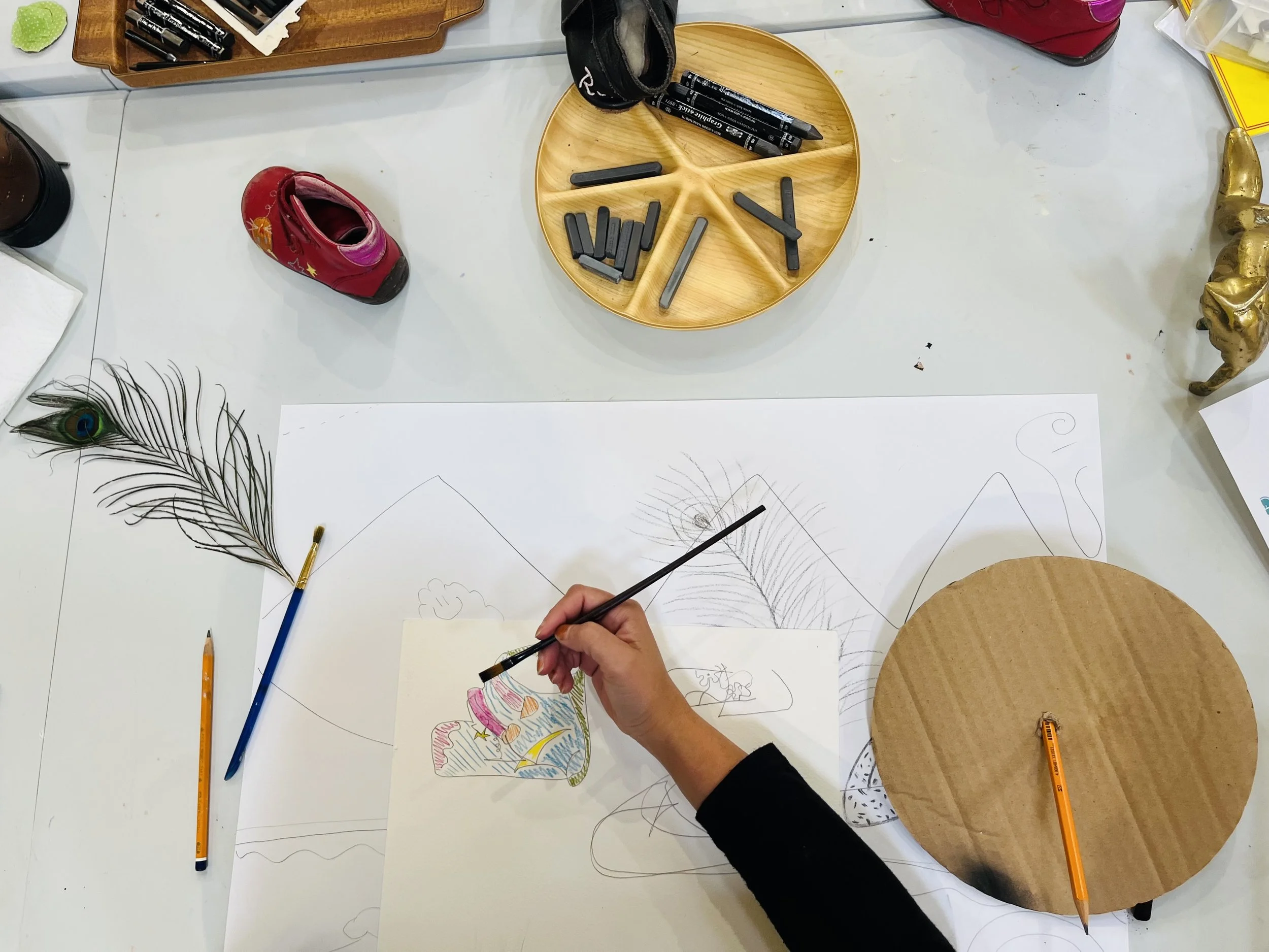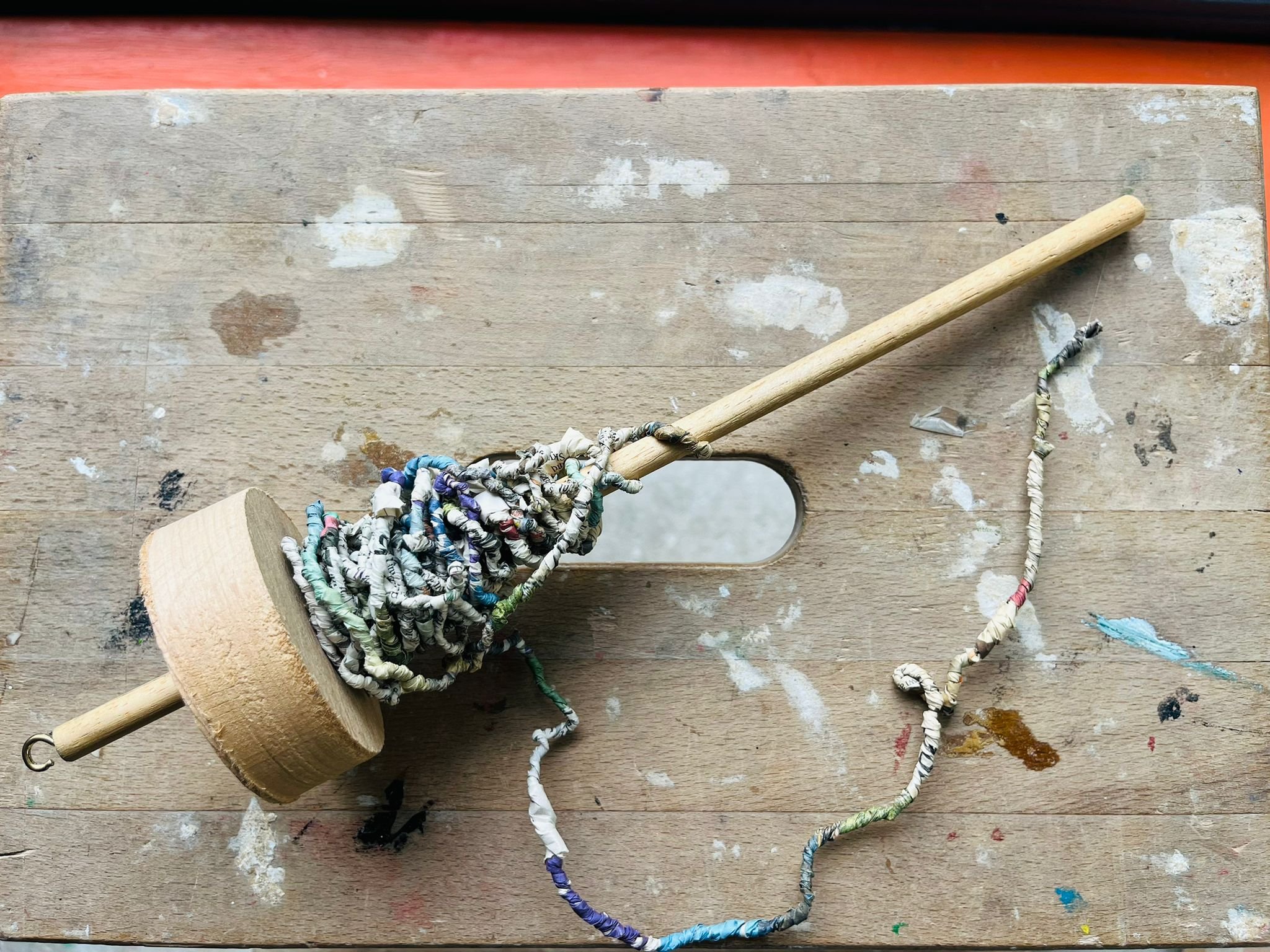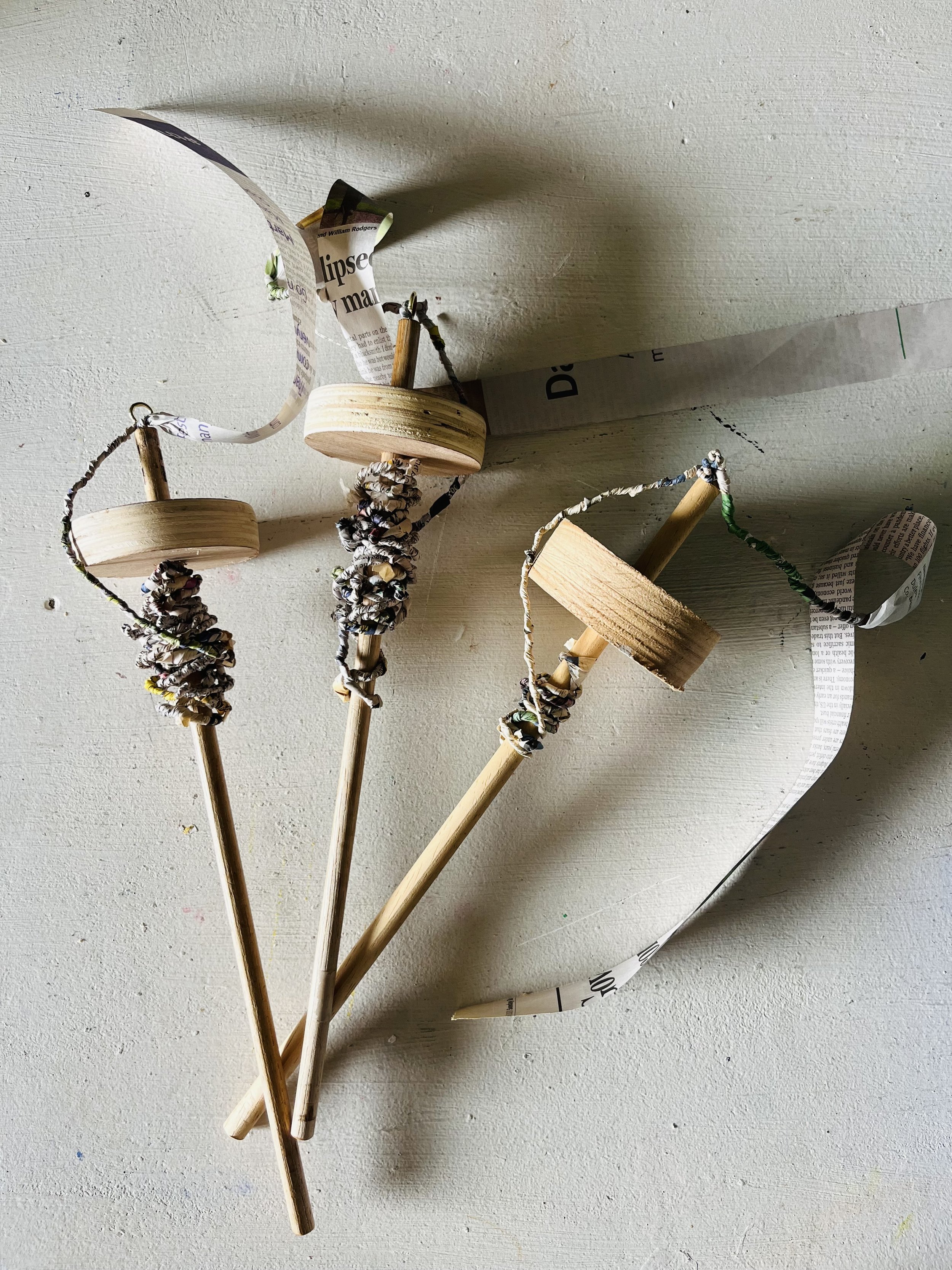 Workshop 1: we explored mark making using pencils, charcoal, graphite sticks and watercolour pencils. Blind drawing helped break the ice for all, as they observed & drew some children’s first shoes. Watercolour pencils added a gentle wash to the drawings. A simple spindle, to twirl strips of paper, allowed up make paper string.