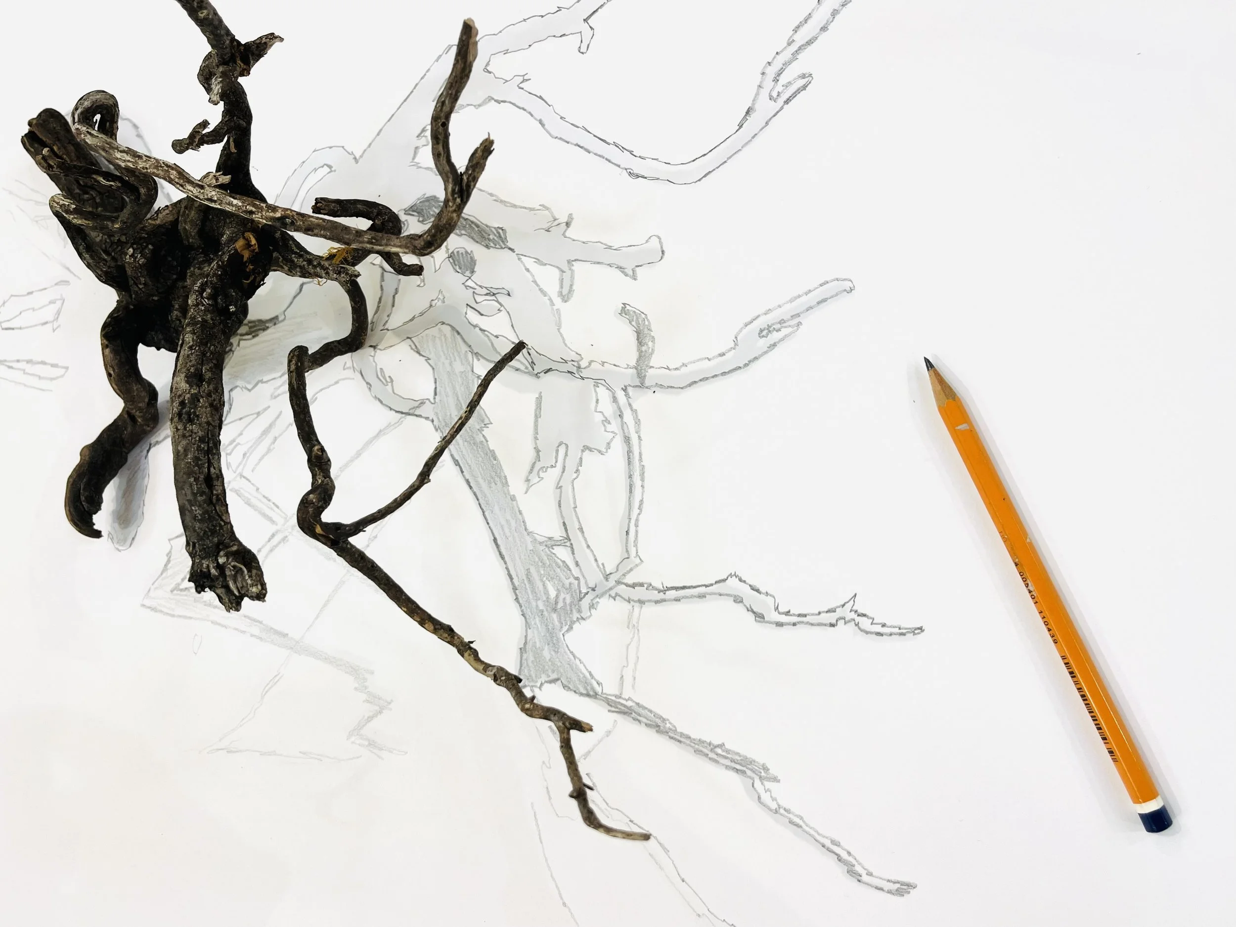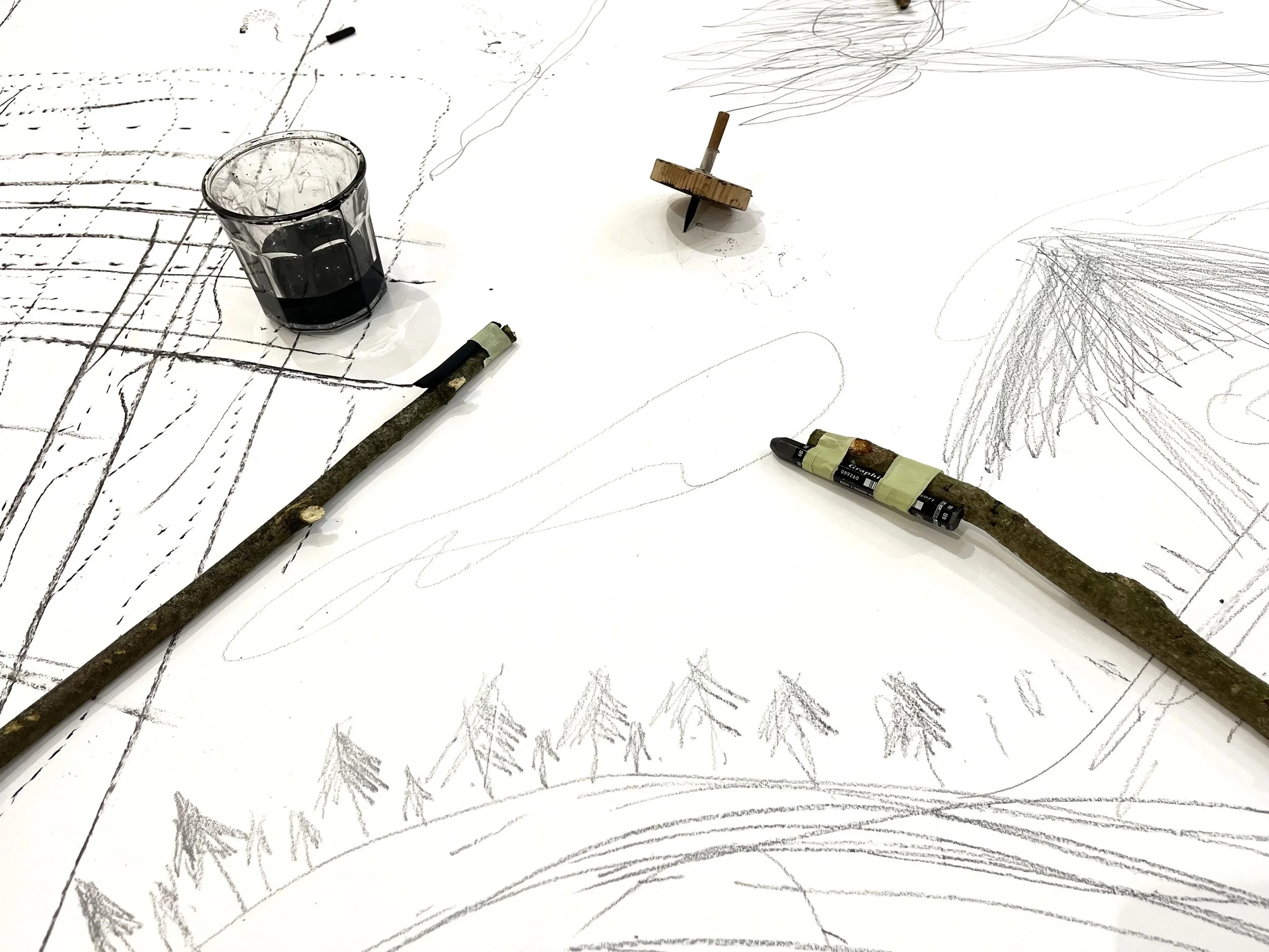 Drawing from a distance using sticks and charcoal & spinners and ink
