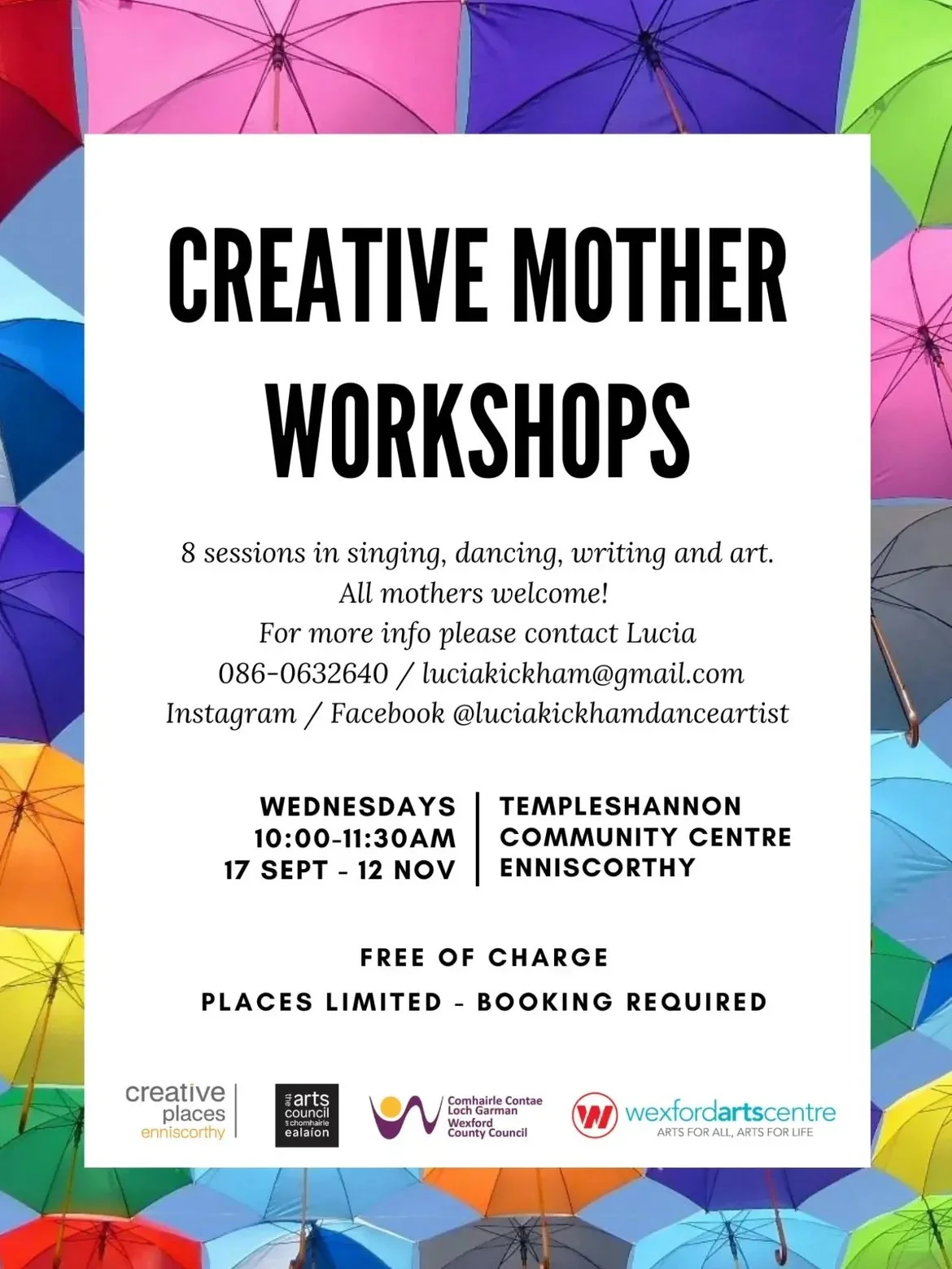 I was kindly asked by dance artist Lucia Kickham to facilitate two workshops in October 2025 as part of her project Creative Mother Workshops. It was a great opportunity funded by Creative Places Enniscorthy for Mothers of any age or stage in motherhood to engage in dance, singing, writing and art sessions. It brought together a lovely group of mothers from various parts of County Wexford and allowed them to connect in this gentle and supportive environment.